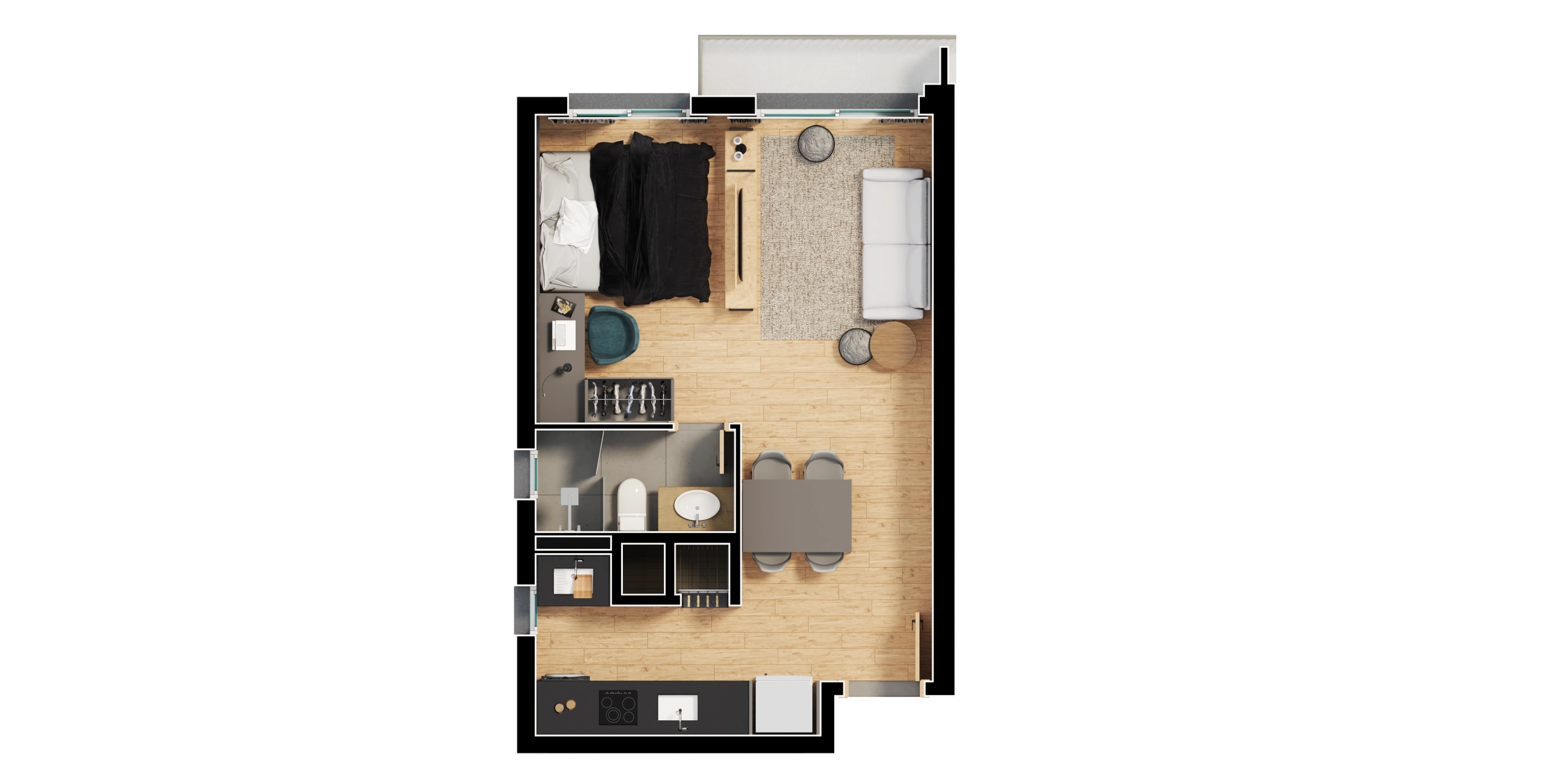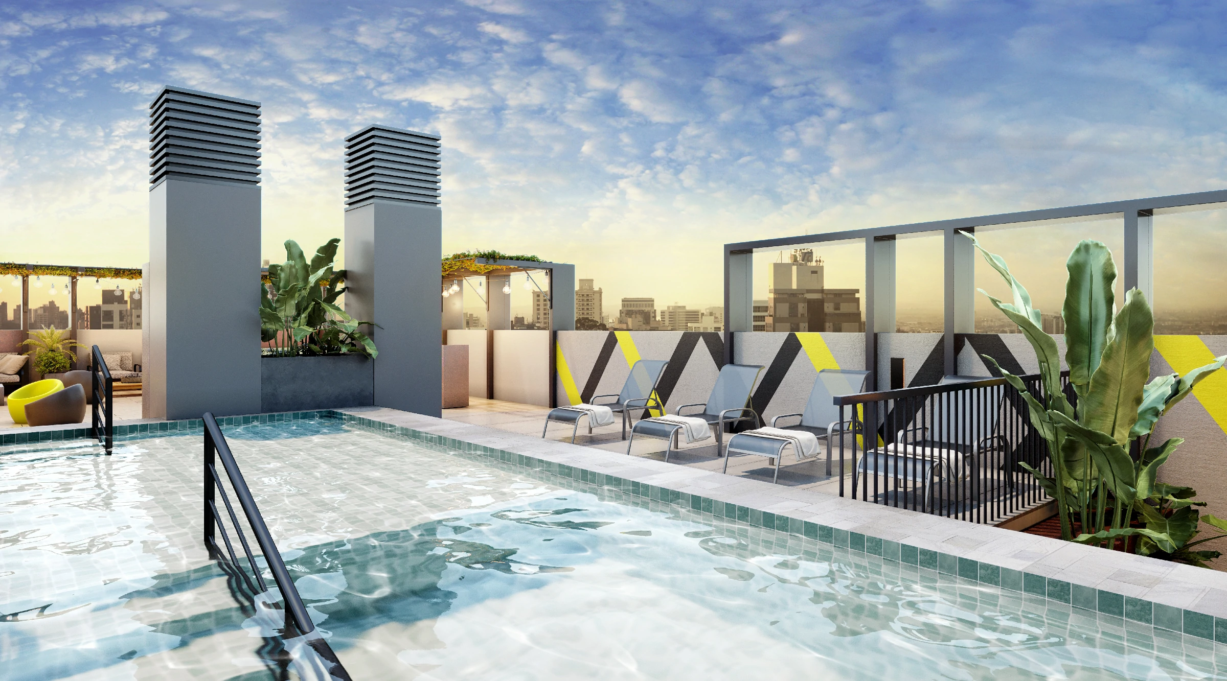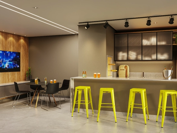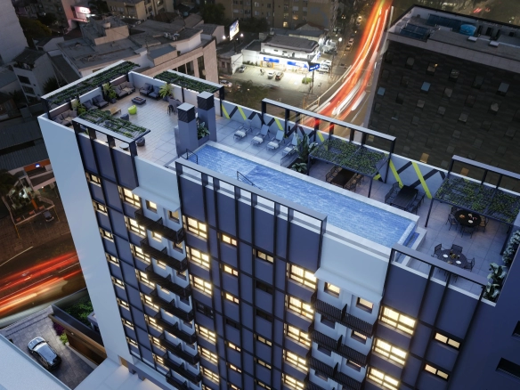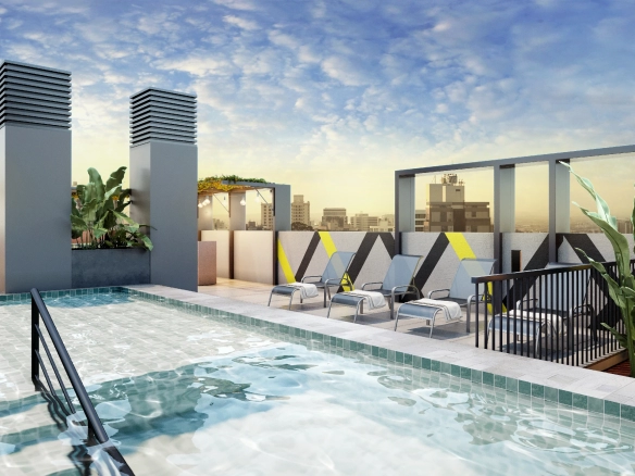 - Apartamentos em tipologias studio (34 m²), 1 dormitório (40–44 m²), 2 dormitórios (62 m²) e 2 dormitórios master (85 m²).