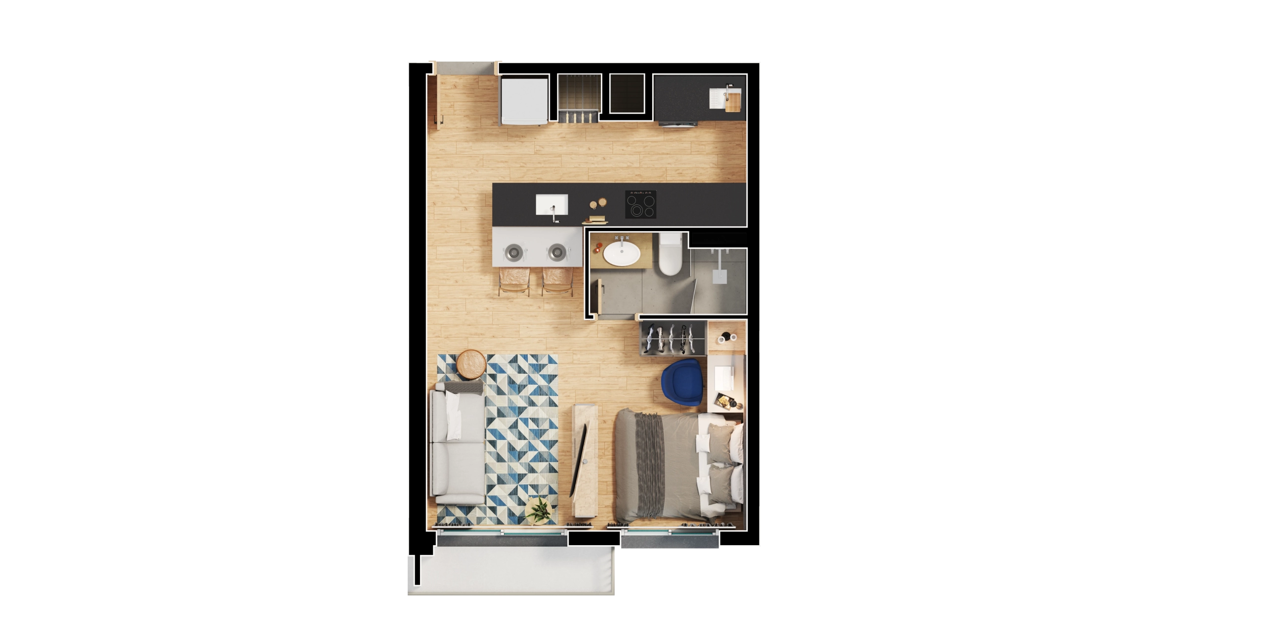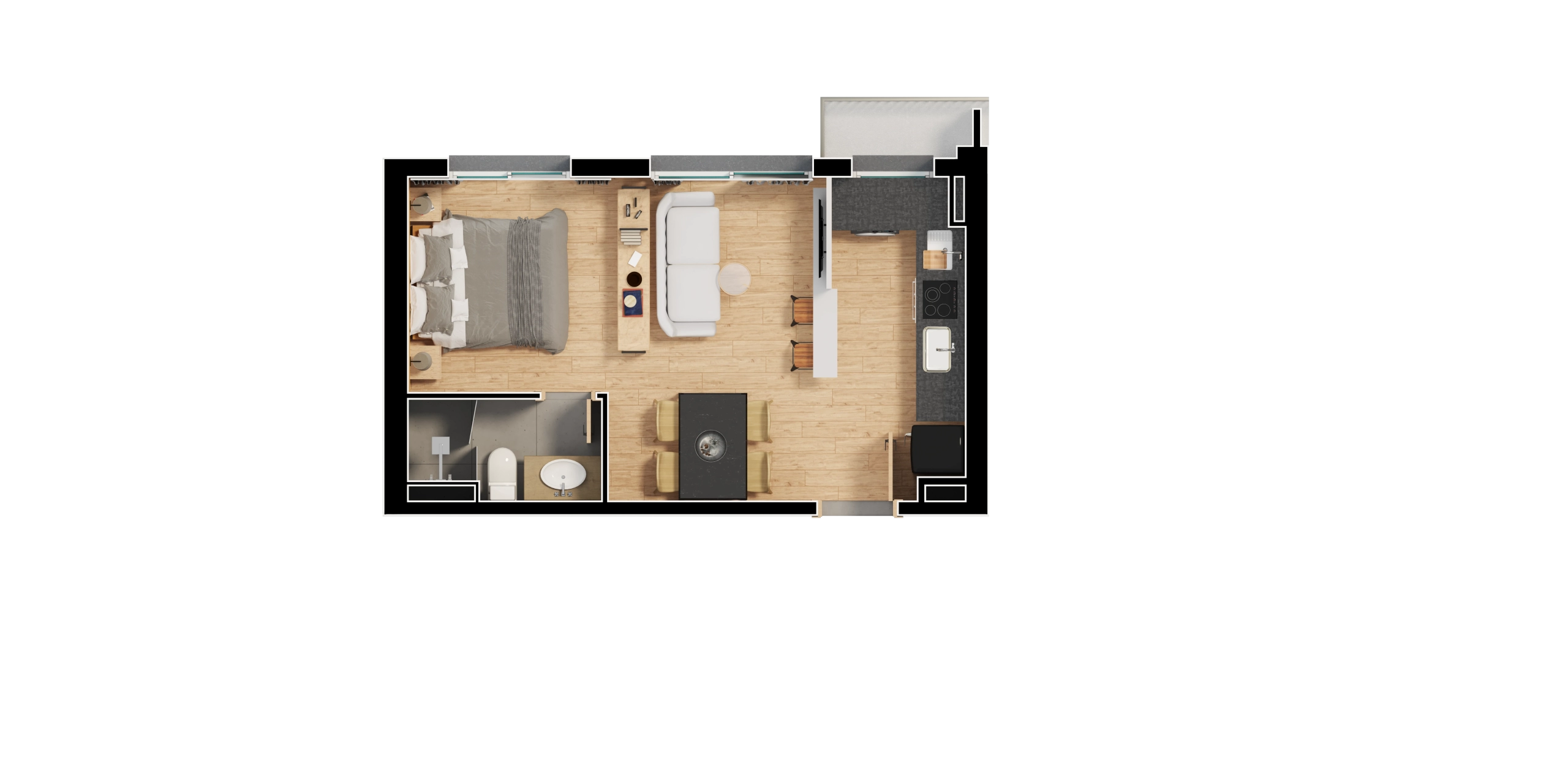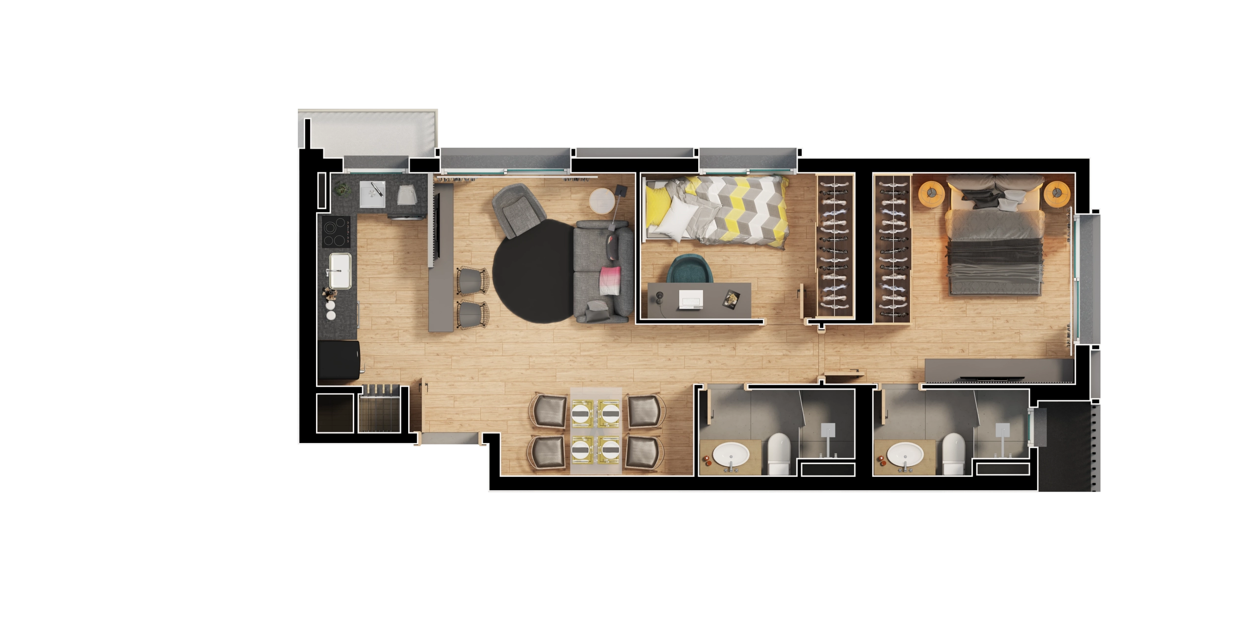 - Apartamentos em tipologias studio (34 m²), 1 dormitório (40–44 m²), 2 dormitórios (62 m²) e 2 dormitórios master (85 m²).