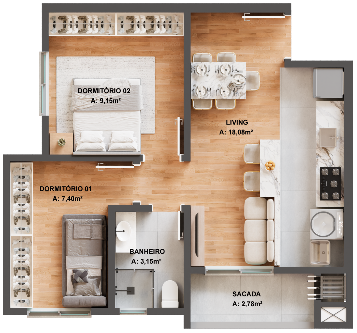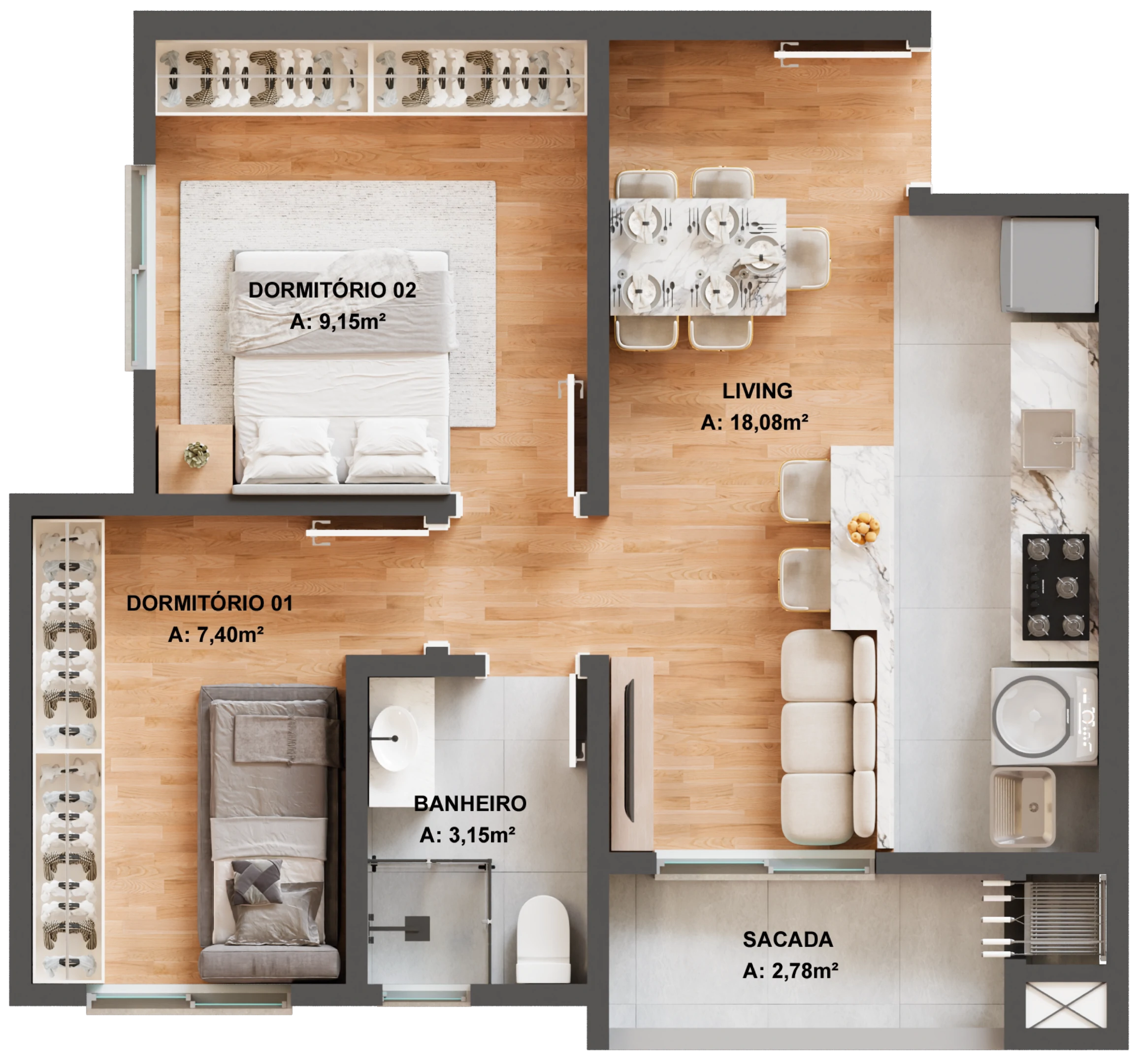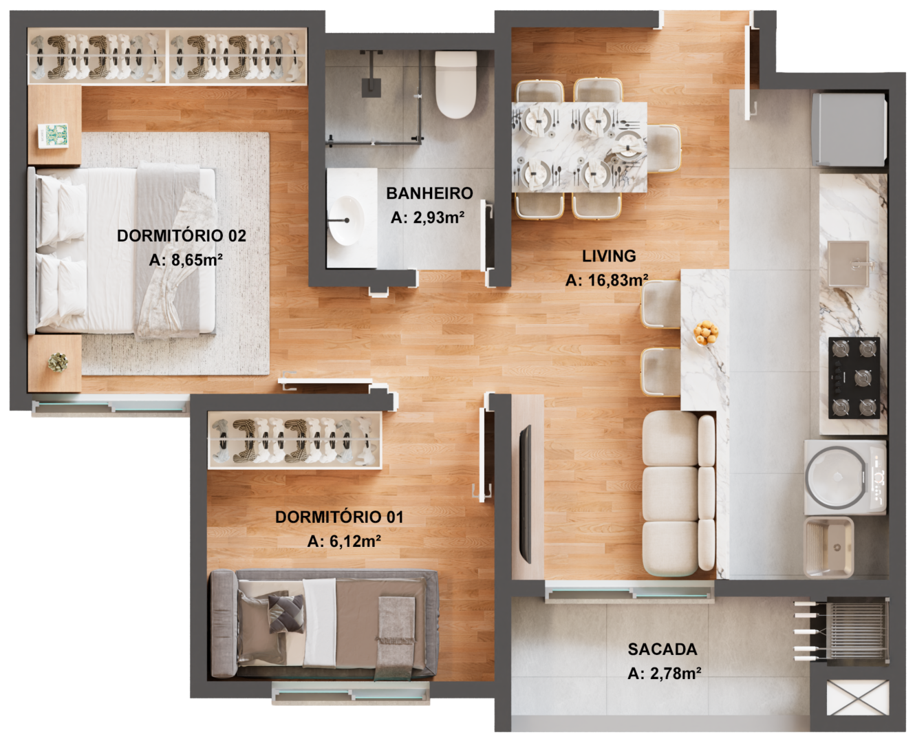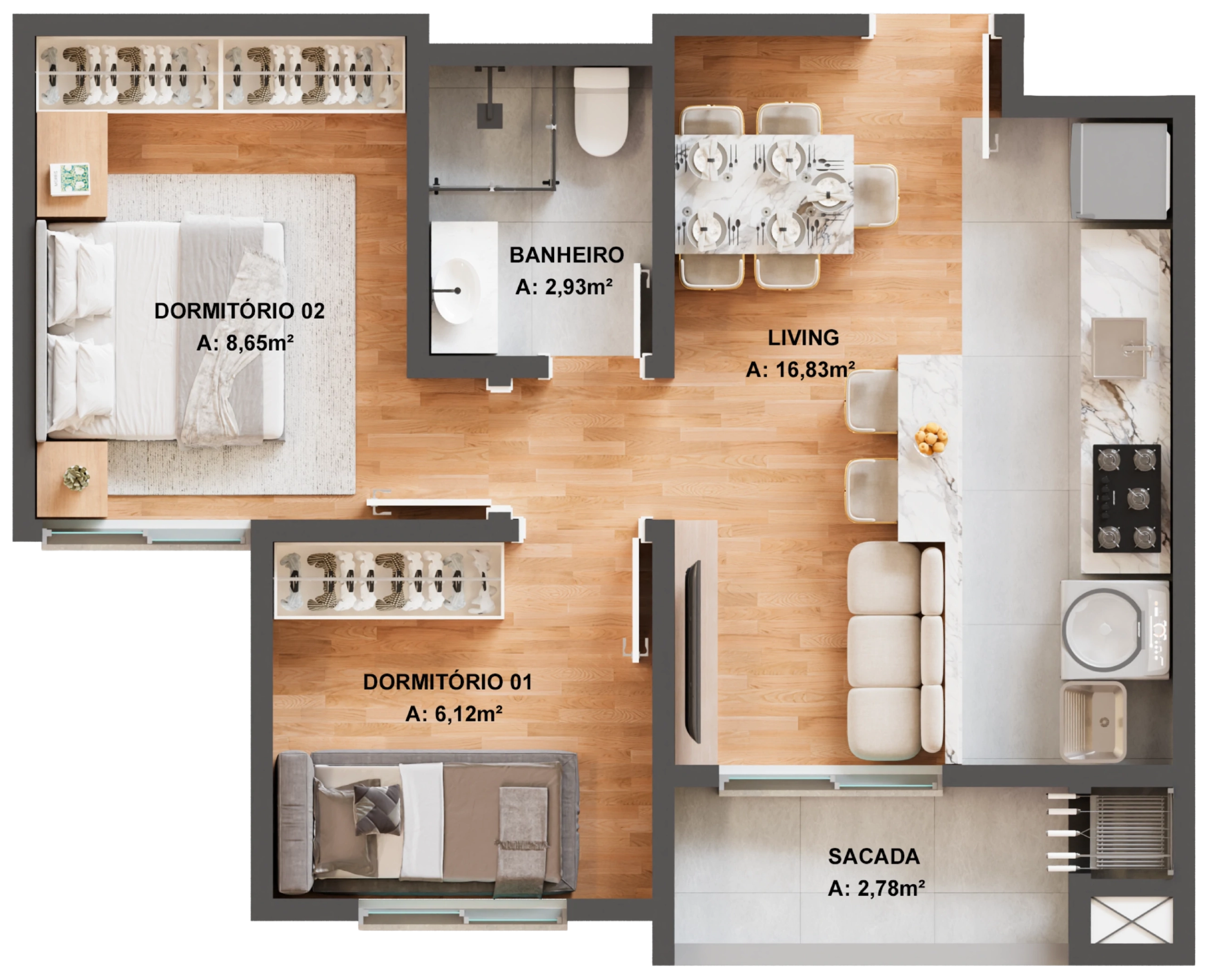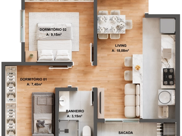- Unidades com 43 e 47m², bem distribuídas, com sacada e churrasqueira para curtir os momentos em casa.