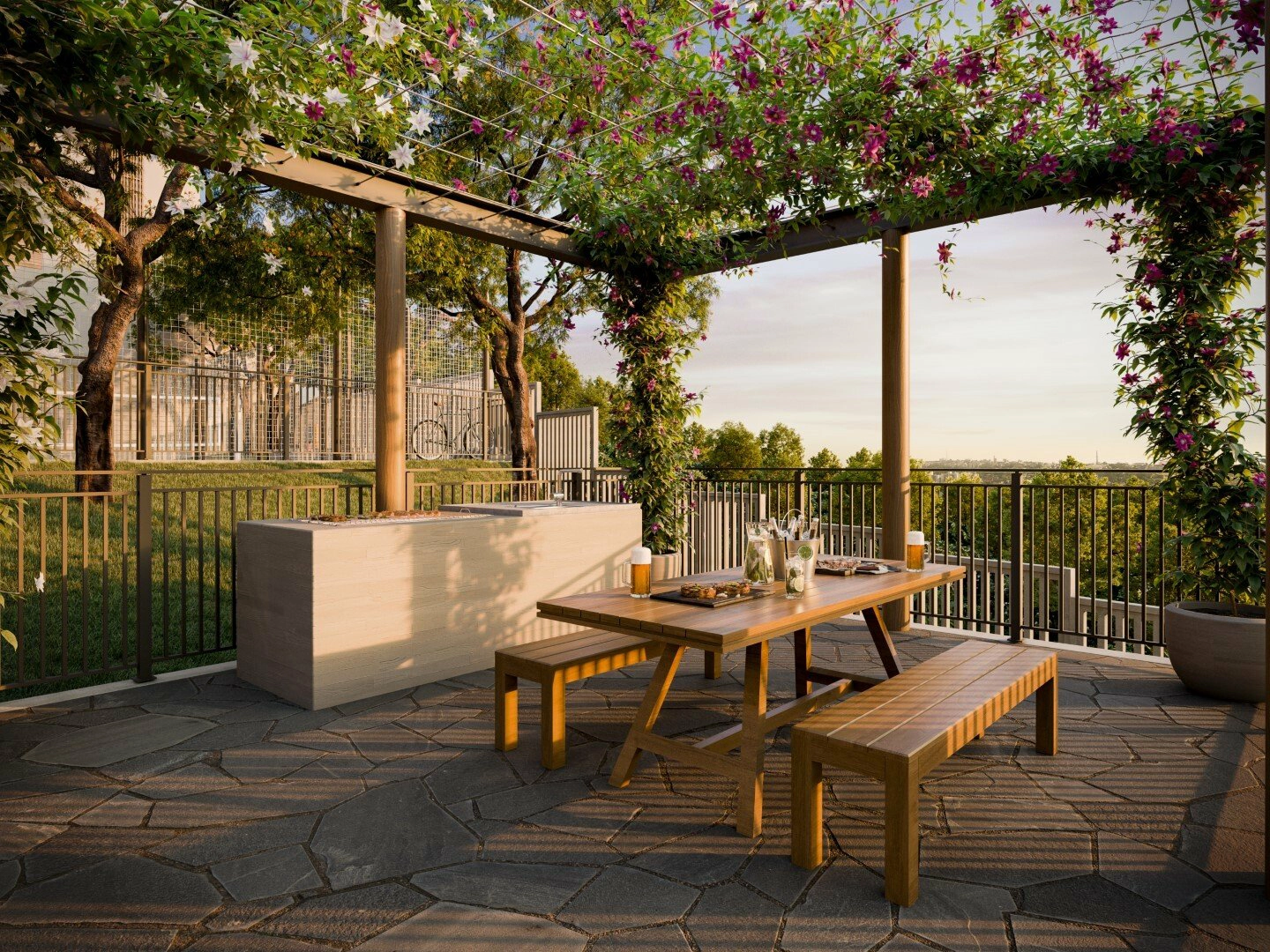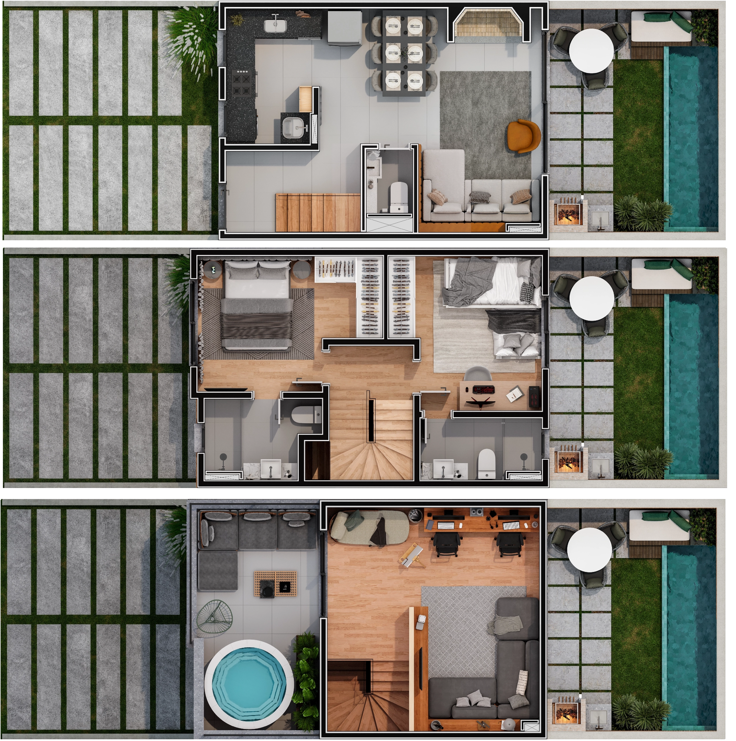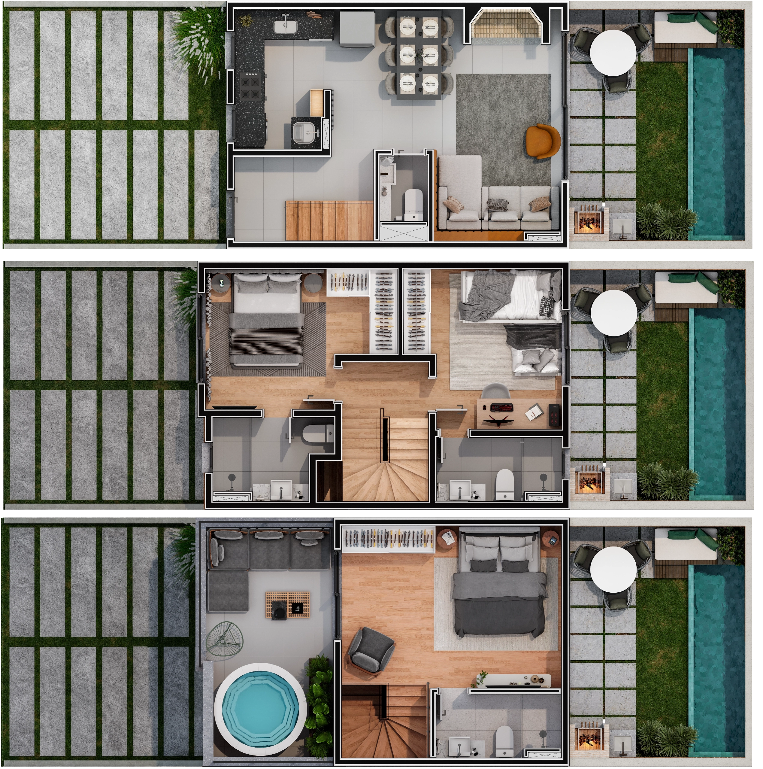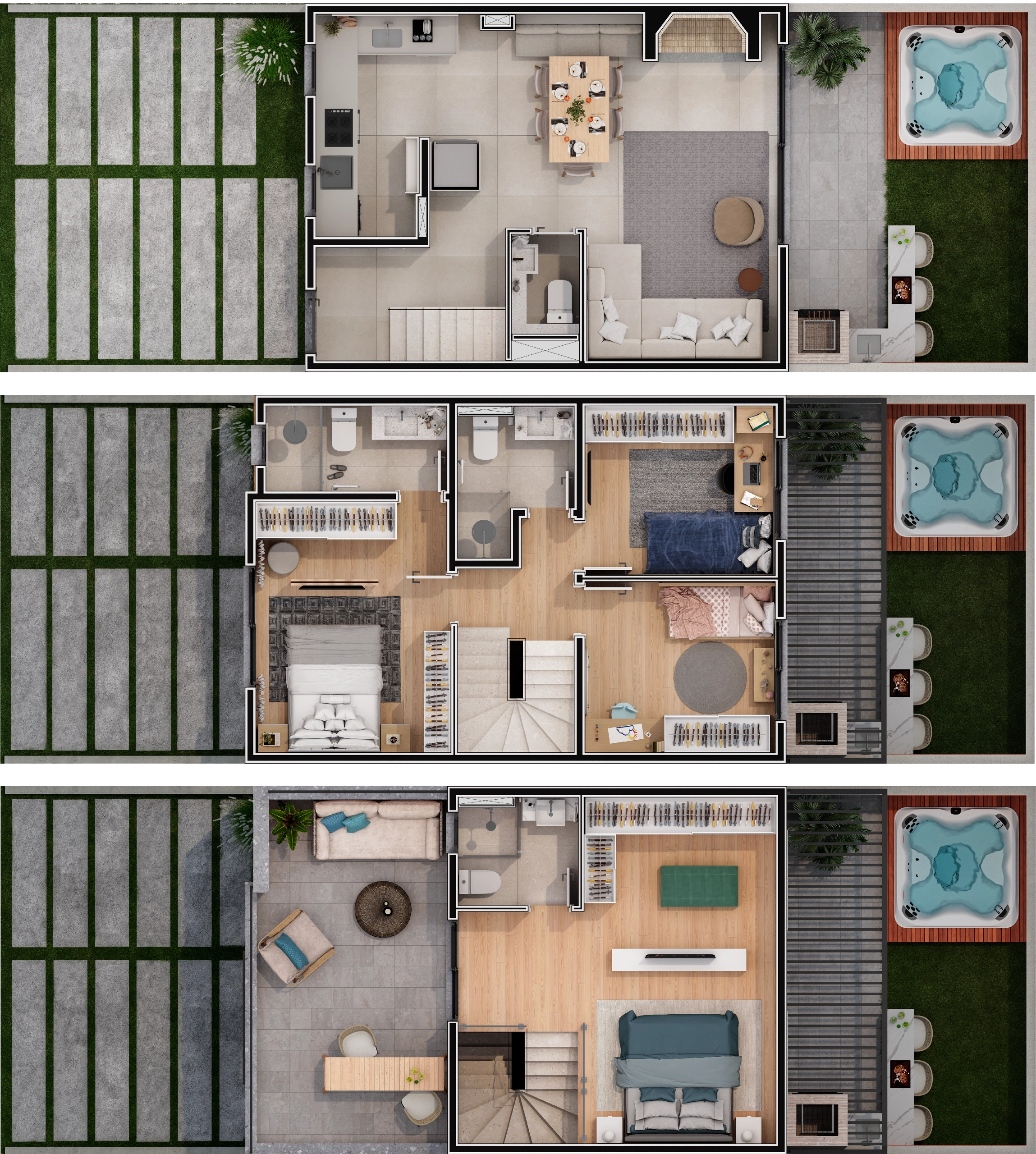 - Áreas privativas de 150 a 173 m², todas com pátio com churrasqueira e 3º pavimento com terraço para múltiplas configurações.