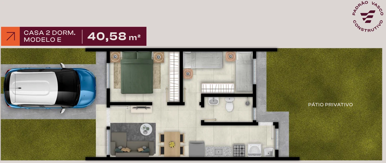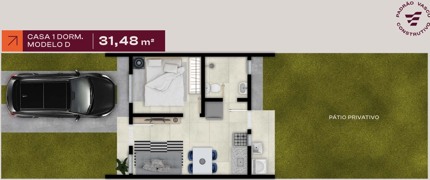 - Casas de 1 e 2 dormitórios, com plantas de 31,48 m², 40,58 m² e 50,95 m².