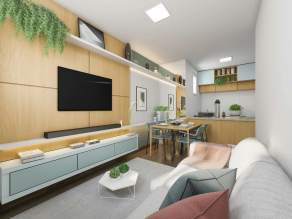 - Plantas de até 61m² de área total, com ambientes bem distribuídos